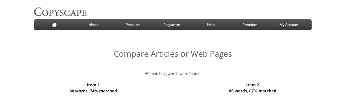 Altrimenti potete usufruire, sempre gratuitamente, del Free Comparison Tool per confrontare esclusivamente due articoli: Copyscape vi mostrerà entrambi i testi con evidenziate le parole in comune e la percentuale di match tra i due. Già questo strumento può essere un’utile sentinella di un plagio.
