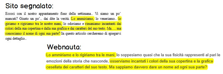 Leggo in velocità l’articolo segnalato come copiato e in effetti quelle parole mi suonano troppo famigliari. Apro il link al mio webnauta e…