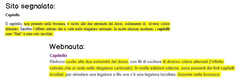 Tempo fa ho avviato una ricerca in Google per scoprire come si chiama il dorso del libro, se non ricordo male (mi pare di ricordare che fosse, quella, la prima volta che ho visitato il tuo sito), e tra i migliori risultati c’erano proprio il tuo articolo (che ho usato come riscontro) e quello, appunto, della nota stamperia. Beh, in quell’occasione ero troppo assorbito dalle mie cose per scandalizzarmi a causa del copia/incolla (ammetto di averci riso su brevemente per poi rituffarmi nelle mie cose a capofitto), tuttavia non mi era sfuggito (ricordo di essere tornato sul loro sito per stabilire chi dei due avesse copiato basandomi sulla data dei commenti più vecchi). Lo ricordo ancora adesso per via del refuso alla voce ‘Coperta o copertina’ (… proteggeva il manoscritto e lo rendeva piu “facili” da consultare) (non posso ancora dirmi scrittore professionista ma a quanto pare ho già sviluppato una discreta deformazione professionale, l’occhio clinico per i refusi 🙂 )
